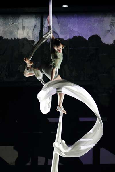 The suspended dual cloth routine is also one that The 7 Fingers has employed for years and it’s always stunning to see the ingenuity with which the acrobats wrap their arms and legs in the cloth and unravel themselves like yoyos, also coming perilously close to contact with the stage.